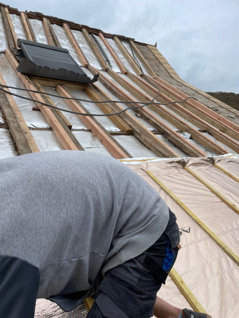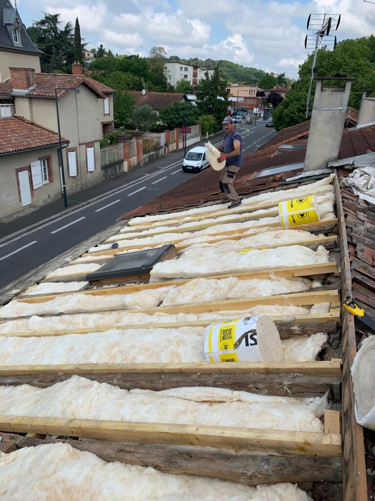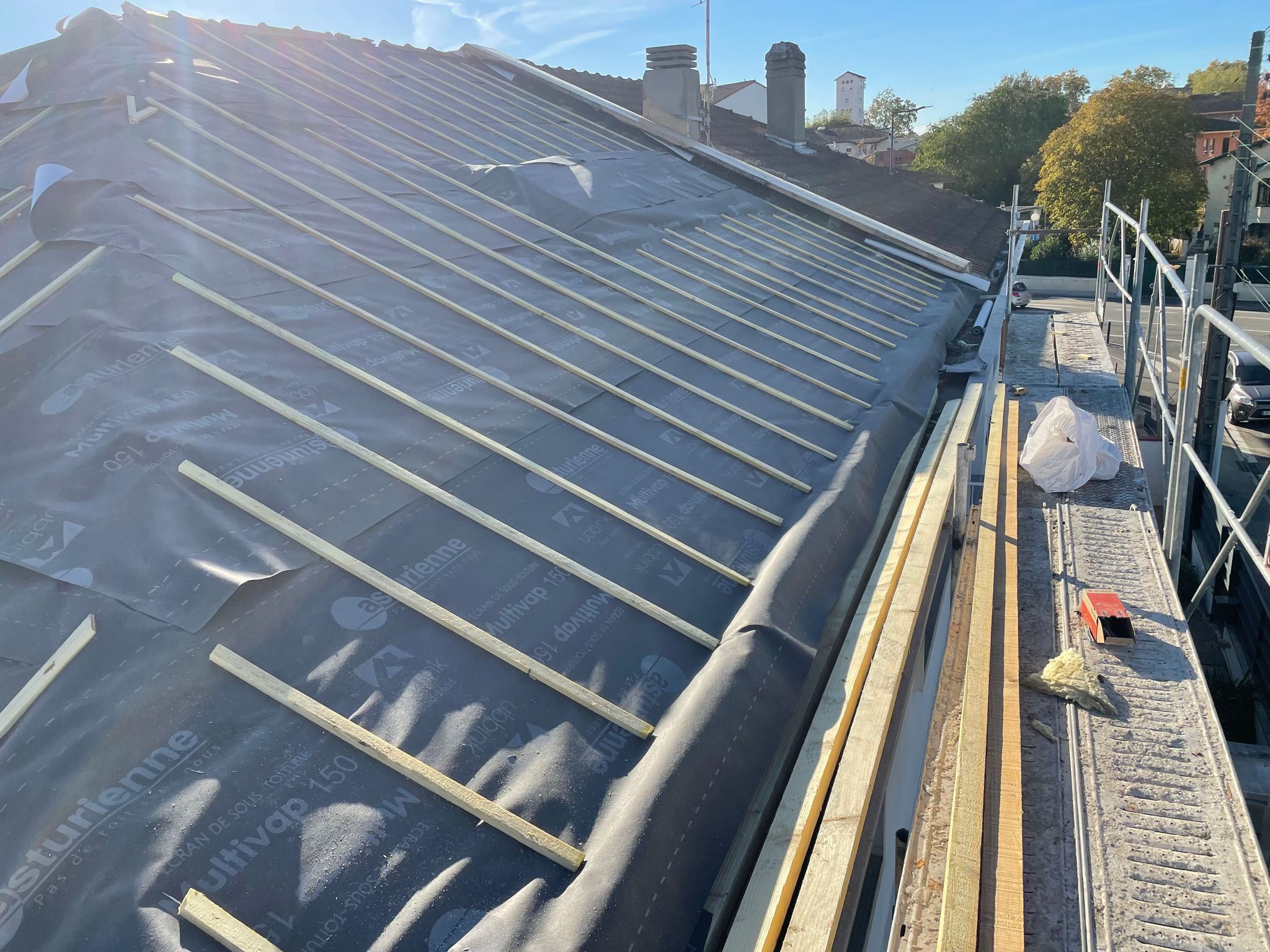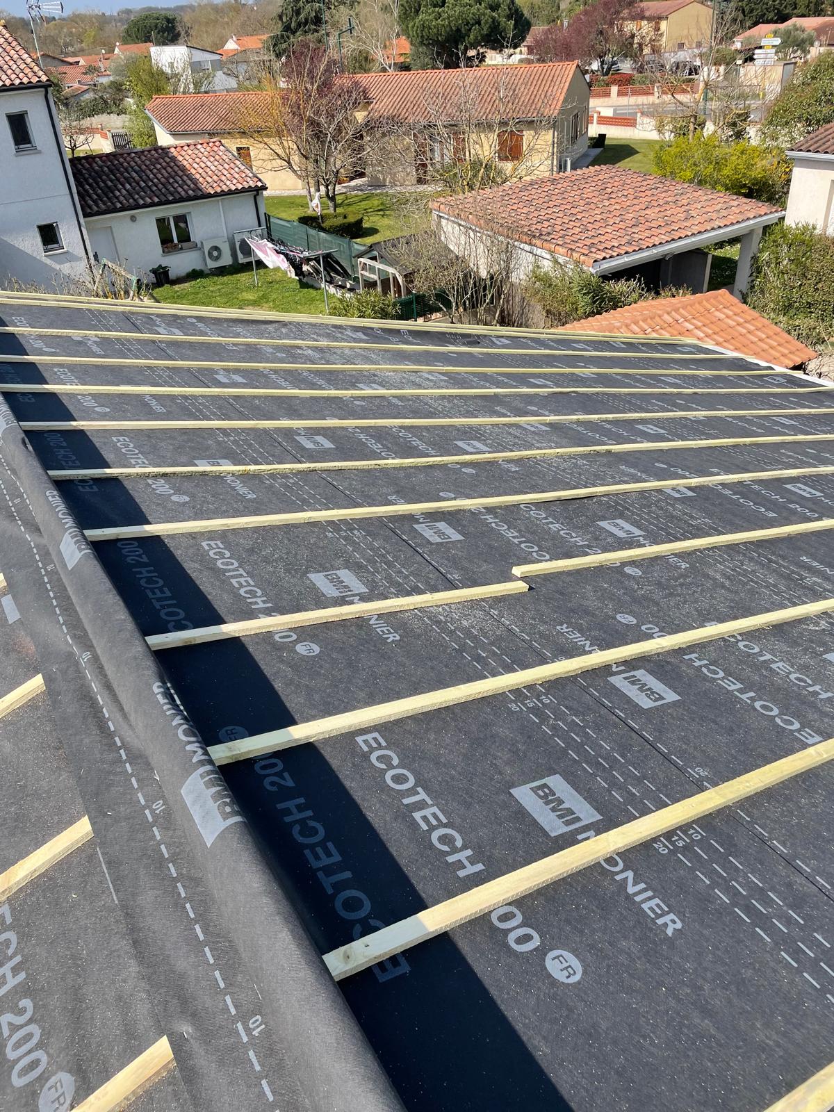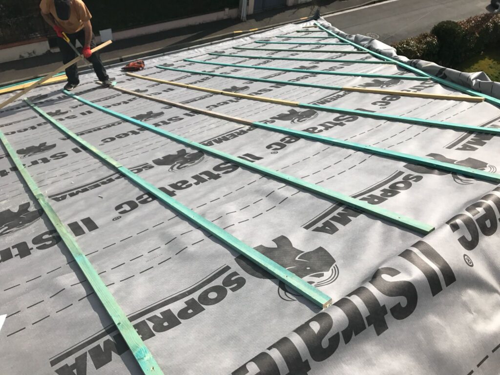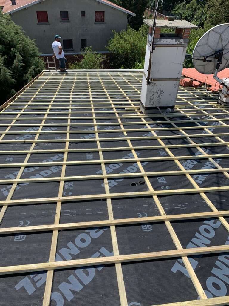 Dans les zones soumises à des conditions climatiques variables, cette protection est d’autant plus importante. Nous utilisons des écrans de sous-toiture HPV (Hautement Perméables à la Vapeur) qui permettent à l’humidité intérieure de s’évacuer tout en bloquant les éléments extérieurs. Cela évite les phénomènes de condensation et prolonge la durée de vie de l’isolation et de la charpente. Nos couvreurs s’assurent que la pose est réalisée dans les règles de l’art : chevauchement précis des lés, fixation adaptée à la pente du toit, gestion des points singuliers (cheminées, fenêtres de toit, rives…). Grâce à cette intervention, vous bénéficiez d’une toiture plus étanche, durable et performante sur le plan énergétique.